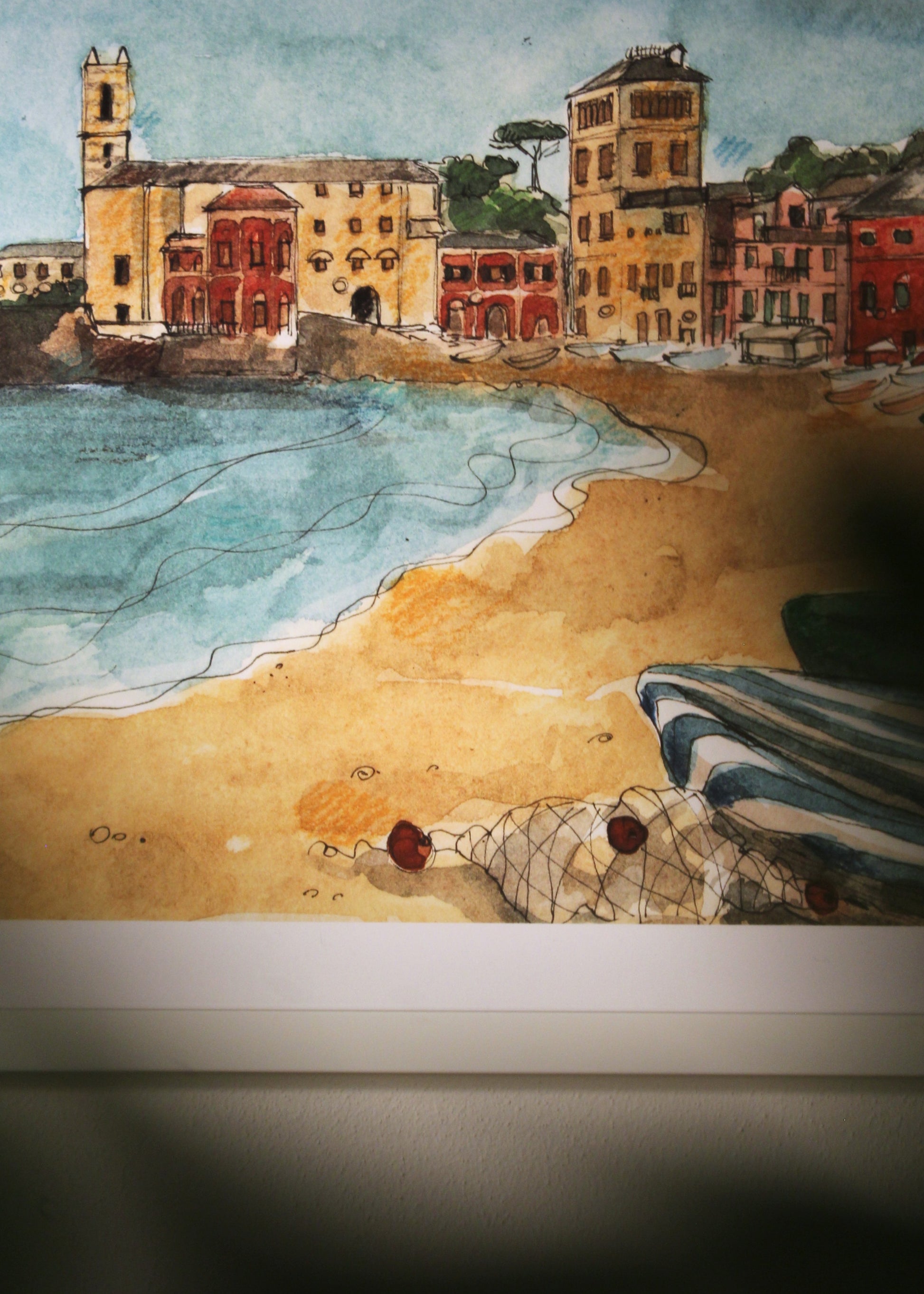 Una stampa artistica creata da una mia illustrazione originale ad acquerello e inchiostro, ispirata alla magica Baia del Silenzio di Sestri Levante, uno dei luoghi più suggestivi della Riviera Ligure.