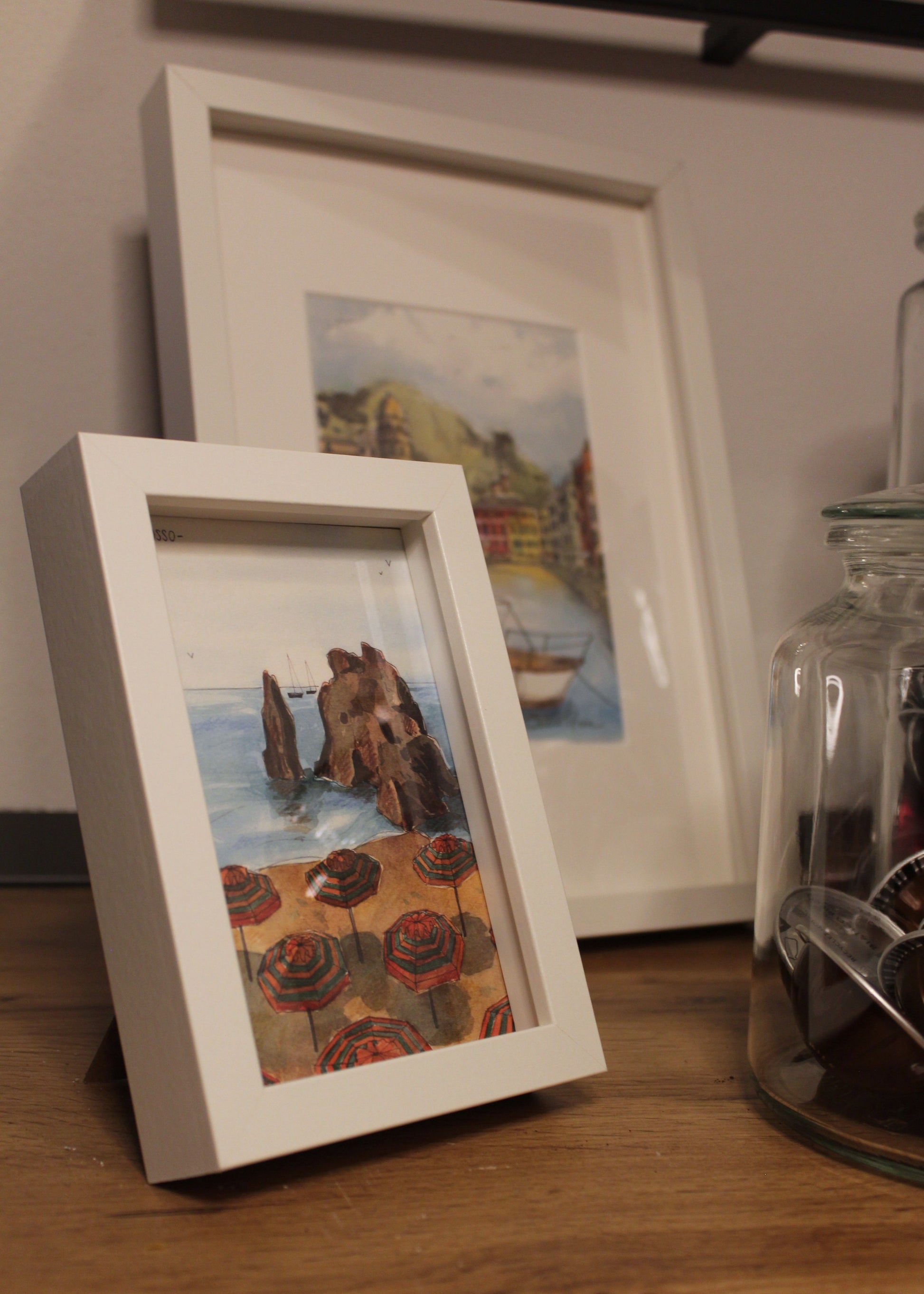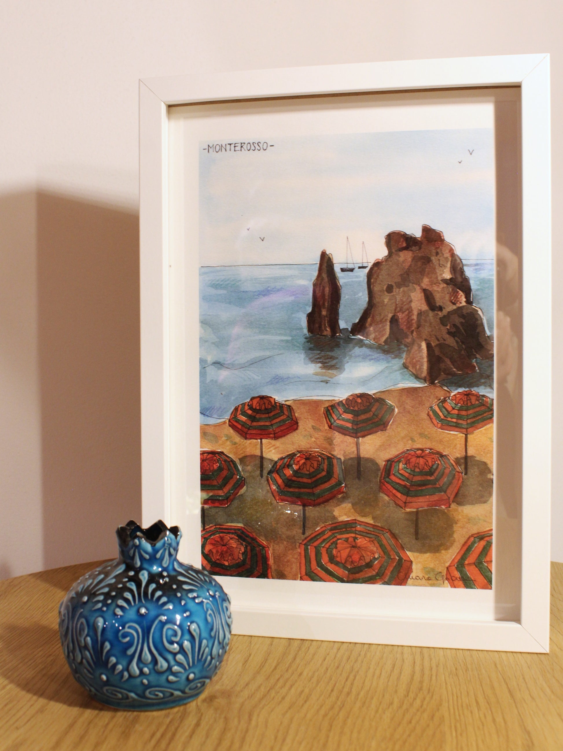 Una impresión artística creada a partir de mi ilustración original en acuarela y tinta, inspirada en el encantador puerto de Riomaggiore, en el corazón de Cinque Terre.