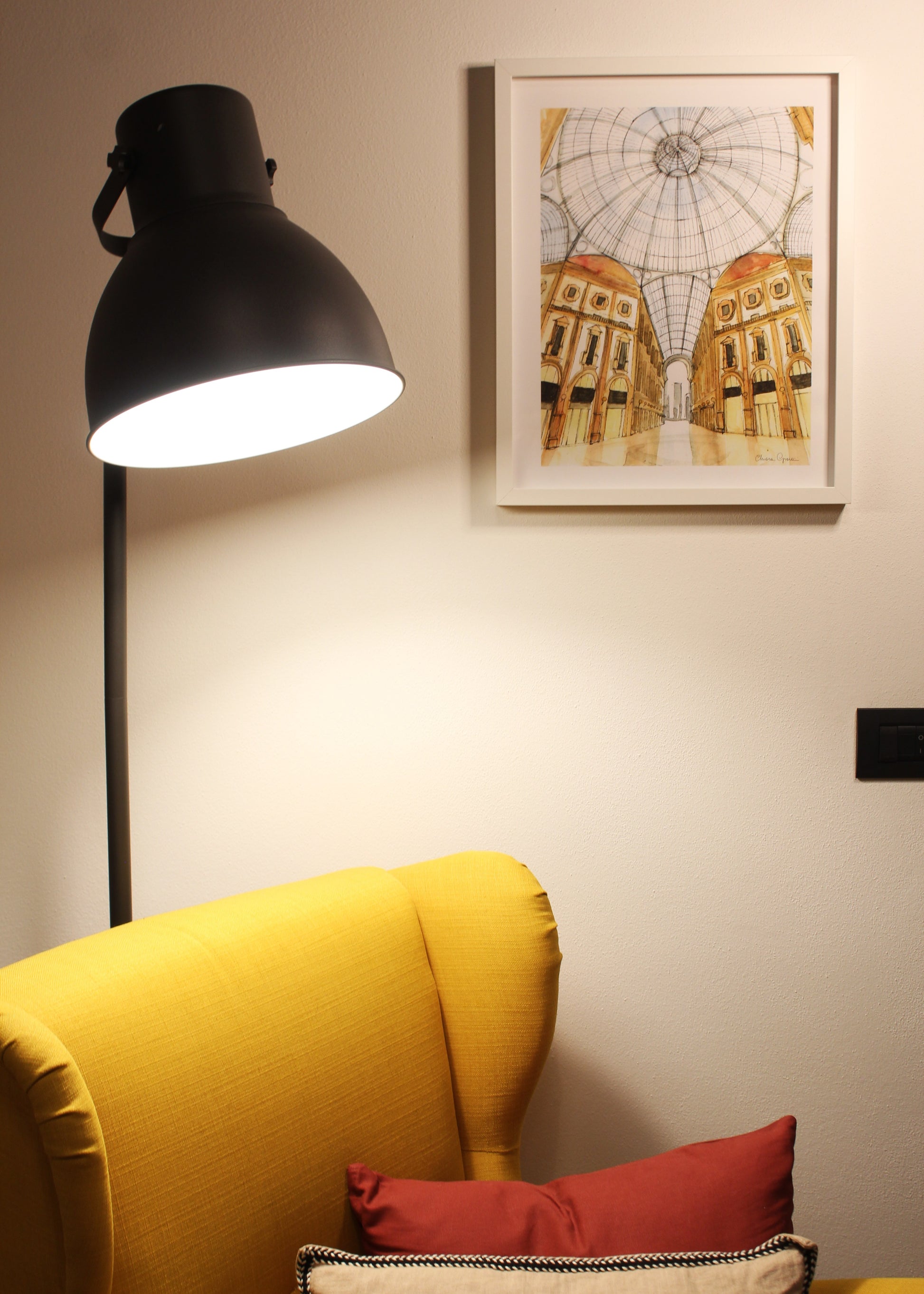 Una stampa artistica creata da una mia illustrazione originale ad acquerello e inchiostro, ispirata alla magnifica Galleria Vittorio Emanuele II di Milano, simbolo di eleganza, storia e architettura urbana.
