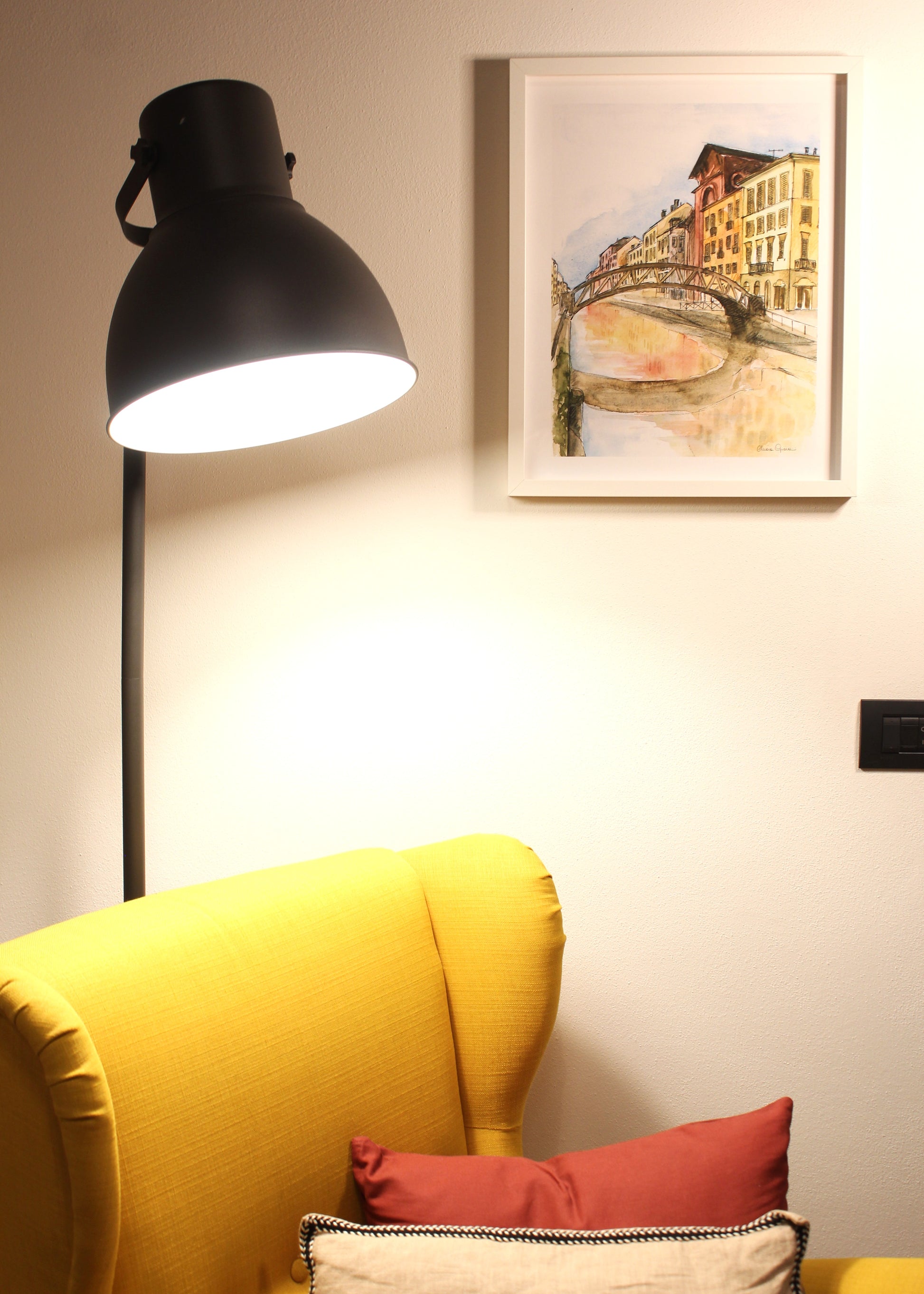 Una stampa artistica creata da una mia illustrazione originale ad acquerello e inchiostro, ispirata al Ponte sul Naviglio Grande di Milano, simbolo di storia e charme urbano.