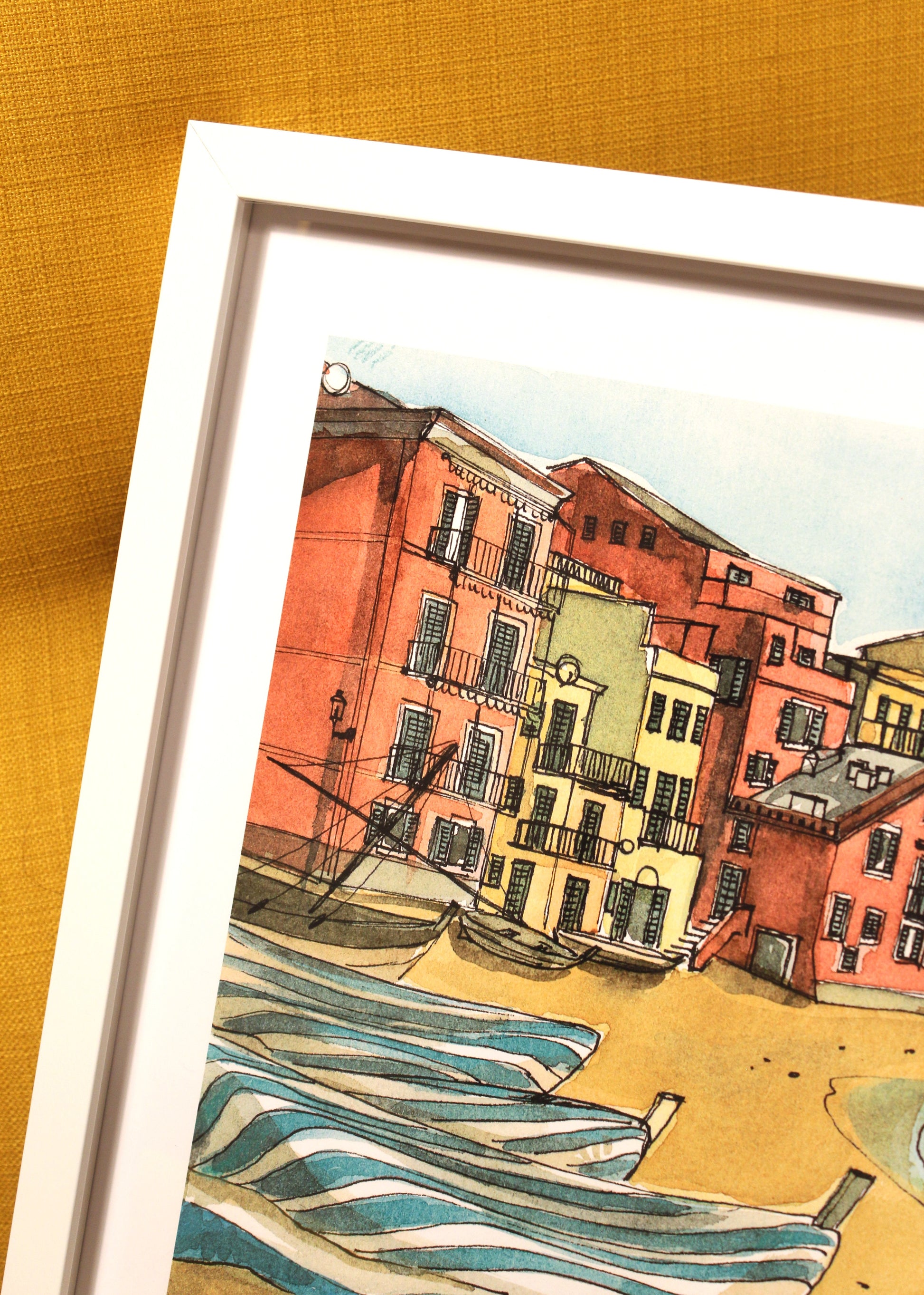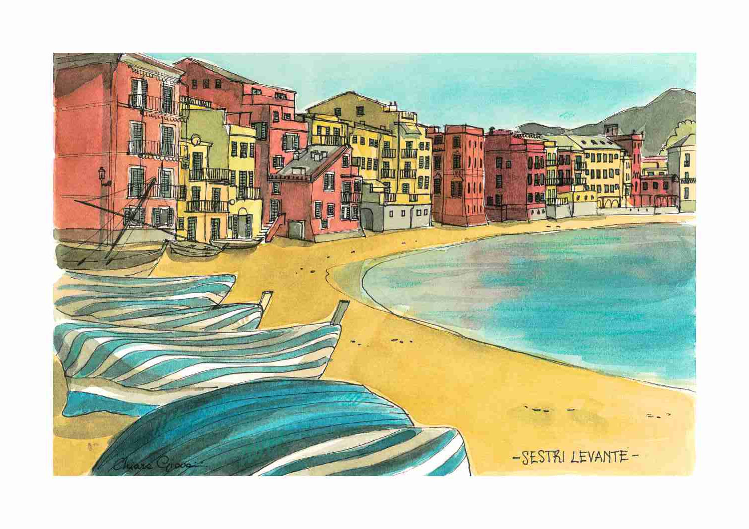 Una stampa artistica creata da una mia illustrazione originale ad acquerello e inchiostro, ispirata alla magica Baia del Silenzio di Sestri Levante, uno dei luoghi più suggestivi della Riviera Ligure.