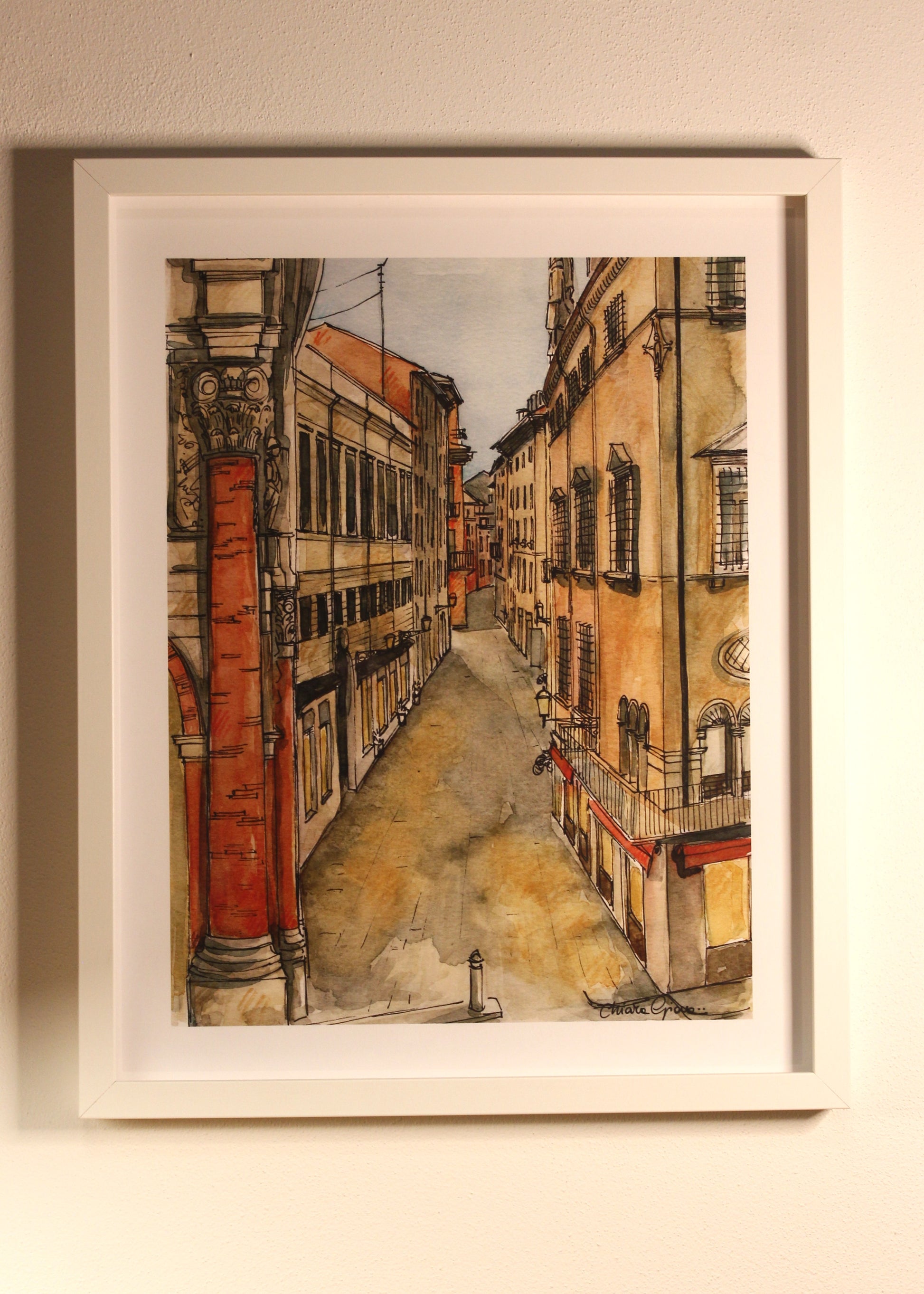 Una stampa artistica creata da una mia illustrazione originale ad acquerello e inchiostro, ispirata a Contrà del Monte, una delle vie più suggestive e raffinate di Vicenza.